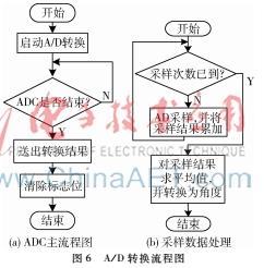 STC12C5A60S2系列单片机自带A/D转换接口,分布在P1口,图6为单片器A/D转换流程图。图6(a)为A/D转换主流程图,图6(b)为ADC数据处理过程。数据处理采用求取平均值的方法[7],数据处理过程中多次采样,剔除采样结果中最大及最小值,再求取平均值,以保证采样结果的精确度。
