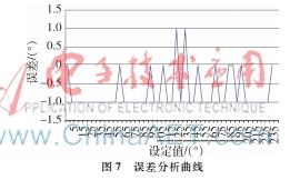 系统搭建并调试完成之后,在0°~235°范围内,每隔5°改变一次设定值,对控制结果进行测试,测试误差在±1°范围内;在数据测试过程中,每改变一次设定值,系统能够非常迅速地达到新的平衡状态且超调量较小,误差曲线如图7所示。