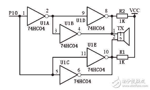 外加信号频率等于两压电晶片的固有振动频率时,将会发生共振,课题中采用的超声波传感器中心频率为40kHz,因此在超声波发射电路中,通过软件编程方式,对单片机I/O口置高和置低,产生40kHz脉冲信号,输出到发射电路中。由于AT89S51单片机I/O口使用时能提供20mA灌电流能力,而吸电流能力较小,所以用74HC04来提高其输出电流的能力,保证40kHz的脉冲信号有一定的功率。超声波发射模块原理图如图4所示。
