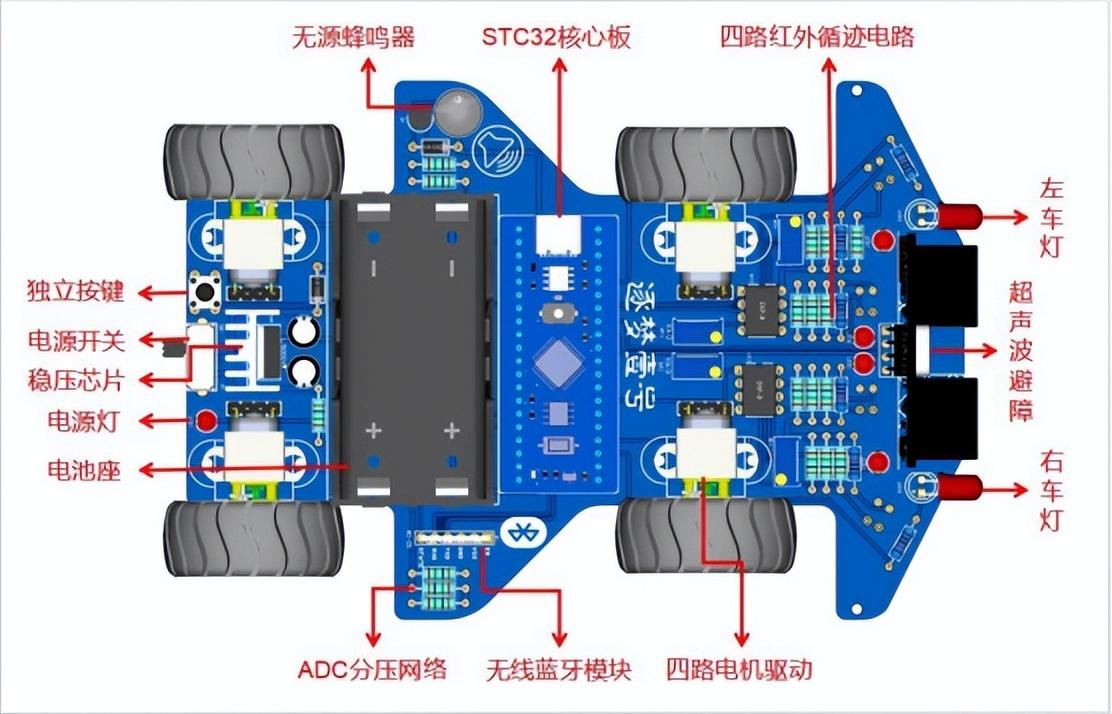 车头放置两个 LED,模拟汽车灯光系统 ,如行驶过程中的单闪,双闪以及近光灯和远光灯的功能,学习单片机的输出功能;使用独立按键,模拟汽车一键启动功能 ,模式切换功能,学习单片机的输入检测;无源蜂鸣器用于产生音乐 及警报功能 ,学习定时器功能配置;路上没电怎么办,使用电池电压检测功能 ,ADC 电阻分压网络给单片机采集电池电压,电量过低时会警报,学习 ADC 电压采集功能;四路电机独立控制,实现小车行走,学习电机驱动“及” PWM 输出功能;前方有障碍物,超声波避障, 读取与前方障碍物的距离,避免撞车,让小车行驶更安全,学习传感器的使用;使用 393 比较器电路与红外光电传感器检测地面黑线,实现小车无人驾驶循迹功能 ,学习传感器的使用;使用蓝牙模块,通过手机 APP 控制 小车行驶,掌握串口协议与数据传输;逐梦壹号功能布局图如下所示: