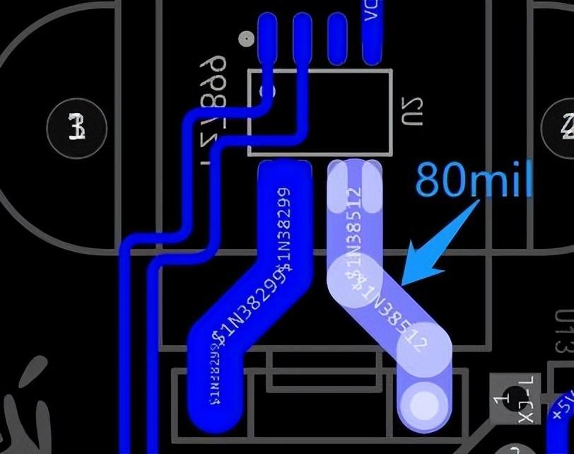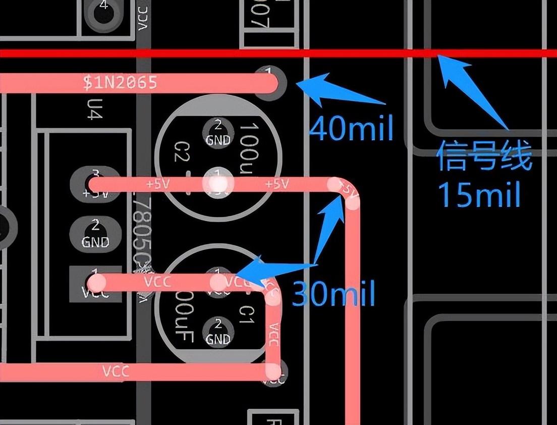 在 PCB 走线时需将电源线适当加粗,网络线粗细程度为:GND 线>电源线>信号线 。
