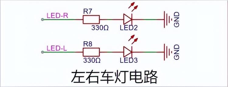 LED 灯的阴极接电源地 GND ,这里限流电阻取值就稍微小一些,让LED 电流更大,灯更亮;LED 灯的程序控制也比较容易,R7 电阻左端连接一个LED-R 的网络标签与单片机引脚连接 ,当引脚输出高电平时,二极管导通,LED 点亮;利用定时器及延时以及 IO 口输出配置 ,就可以实现车灯闪烁以及高亮和弱亮的呈现效果了。