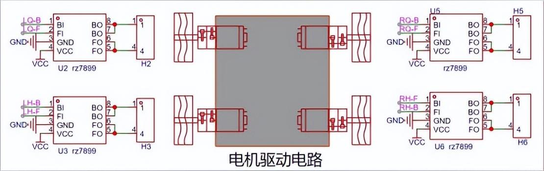 电机电路采用了 RZ7899 电机专用驱动芯片 ,该芯片外围电路简单,非常适合智能小车等小型电机驱动应用。它由逻辑输入端口 BI 和 FI 控制电机前进、后退以及制动,配合单片机 PWM 输出可以控制电机转速。