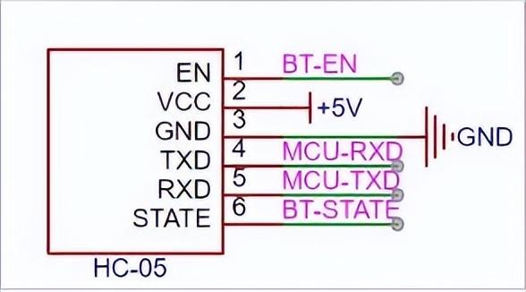 EN 引脚用于控制蓝牙模块进入 AT 指令 ,设置为高电平时,可以设置蓝牙模块的状态与数据传输;VCC 引脚和 GND 引脚为电源输入引脚 ,输入电压范围为 3.6-6V;TXD 和 RXD 是用于与单片机连接的串口引脚 ,其中 RXD 接单片机的 TXD,TXD 接单片机的 RXD 引脚,此处需留意不能接反;最后一个引脚为 STATE 引脚,功能是显示蓝牙配对的状态。 当蓝牙连接上手机时,该引脚输出高电平。图 3-12 HC-05 蓝牙主从模块