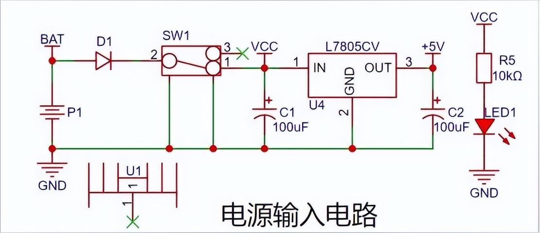 图中P1 为双节 14500 的电池座,装上电池后,经过 D1 防反接的二极管,开关 SW1 打开,电源通过 7805 线性稳压器稳压到 5V 输出。