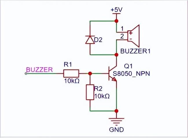 S8050 三极管起开关作用,当输入信号为高电平时,三极管导通,蜂鸣器发声。 二极管 D2 为续流作用,保护蜂鸣器不会损坏。