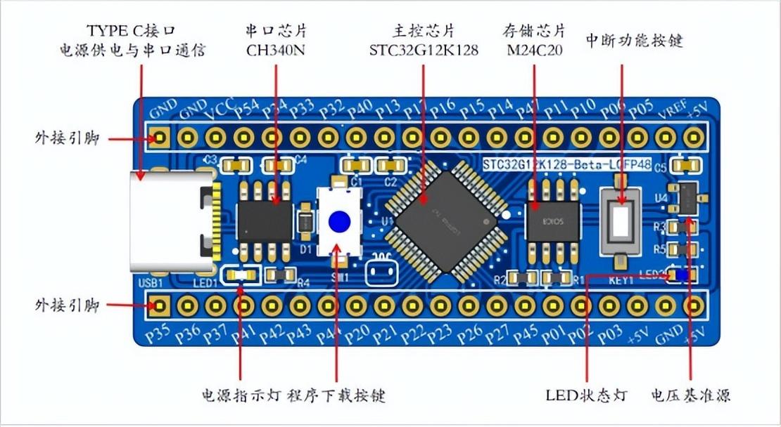 核心板上板载 CH340N 串口芯片 ,配合程序下载按钮,可以直接进行程序烧录以及串口调试。24C02 Flash 存储芯片用于程序空间的扩展 ,适应更加复杂的项目开发使用 431 基准源给芯片提供稳定的基准电压 。作为最小系统必备的独立按键和 LED 灯也是必不可少的单独对核心板进行学习,也能够掌握 STC32 的基本开发能力,接下来要做的就是通过一些扩展项目加强个人能力和培养与项目开发的能力。