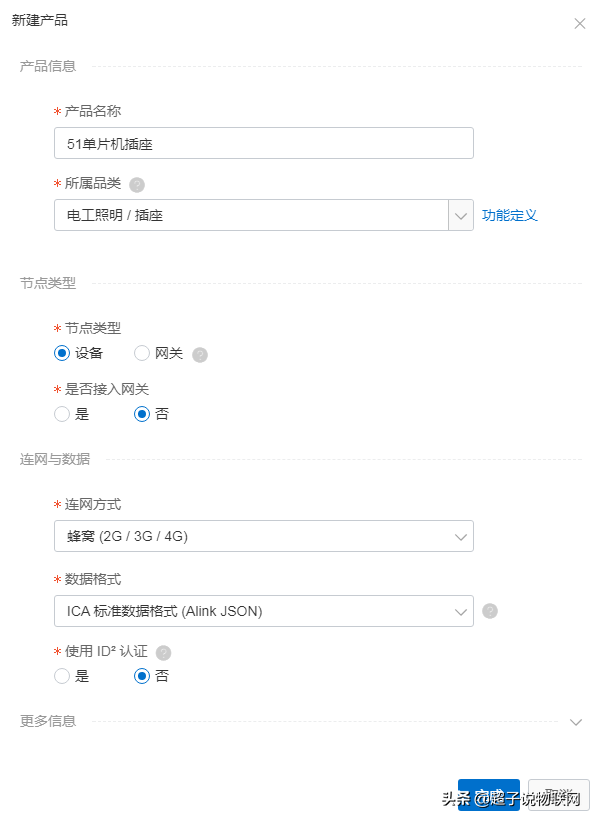 产品名称就叫51单片机插座,大家也可以起自己喜欢的名字。然后所属品类选择电工照明下的插座。节点类型选择设备,不接入网关,因为ESP8266可以连接WiFi路由器,直接具备接云的能力,所以是直连设备,不需要网关。连网方式一定要注意,虽然ESP8266是WiFi模块,但是不能选择WiFi连网,因为我们使用的是通用的,AT指令控制的ESP8266,没有在阿里云生活物联网平台认证,不兼容阿里云生活物联网平台APP的配网协议,如果我们选择WiFi方式的话,配网过不去,程序设计就无法进行了。所以我们取个巧,使用蜂窝连接方式,跳过阿里云生活物联网平台APP的配网,我们可以用ESP8266模块自己的APP配网或是直接把WiFi的SSID以及密码写在程序里。然后数据格式选择JSON,不适用ID2认证,最后点击完成就行了。
