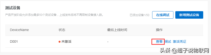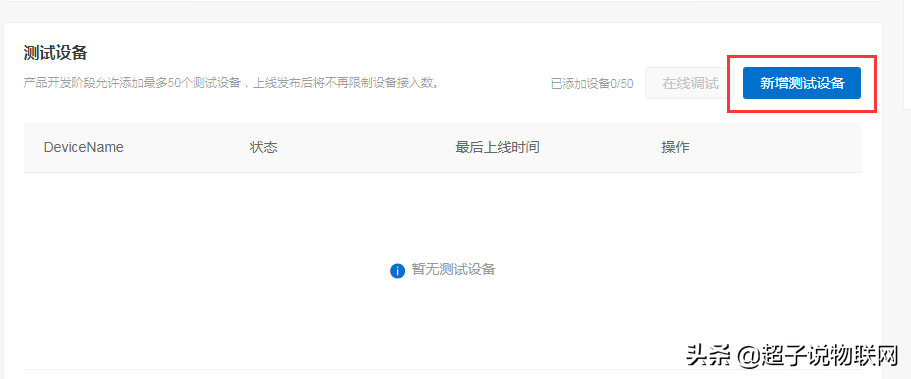 选好模组后,我们点击新增测试设备,每个产品下可以添加最多50个免费的测试设备,我们做DIY程序设计,50个足够我们用了。