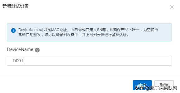 新增测试设备时,我们要输入设备名称,就叫D001吧,超子喜欢用这种编号命名设备,大家可以根据喜好自己设置设备名称,然后点击确定就行。