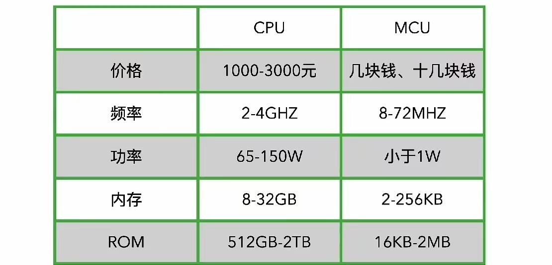 CPU的频率大多是3-4GHz,而单片机的主流频率在8M-72MHz,相差了上百倍,在功率方面,CPU的功率主要集中在65-150W,而常用单片机的正常工作的功率差不多0.1W。在存储方面,CPU的外置RAM大多数是8-32GB,而单片机的RAM是内置的,大致在2-256KB之间。CPU的ROM现在一般多为512GB-2TB的固态硬盘,而单片机内置的ROM大小一半在16KB-2MB之间,现在的计算机几乎都是64位的,,而单片机主要是8位和32位。