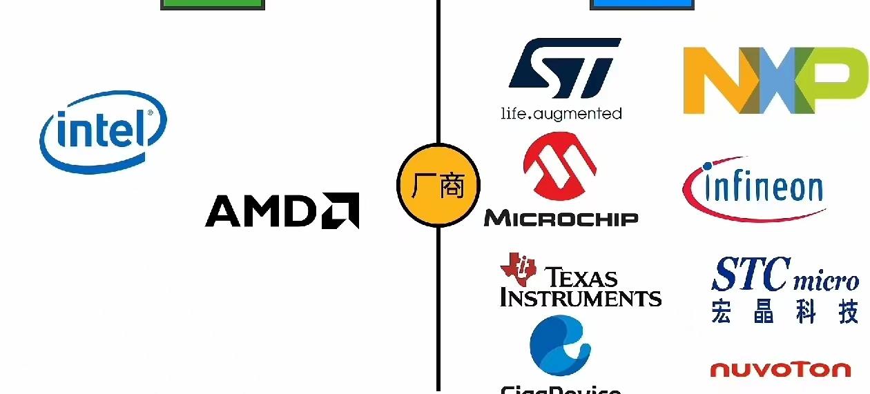 相比于CPU,MCU在性能上进行了大幅的删减,但是也增加了很多东西,接下来我们就来说一些CPU和MCU到底有多大的差异,CPU的运行需要依靠众多的外围器件,比如主板,内存条,硬盘这些才能组成一台计算机。而MCU本身就是一台mini版的计算机,它内部集成了中央处理器,RAM,ROM,MCU,中断系统,定时器及IO接口这些。因为要应对的场合居多,所以单片机的种类也是五花八门。生产CPU的厂商主要有英特尔和AMD,而生产单片机的厂商有很多,比如意法半导体,恩智浦,微芯,英飞凌,德州仪器,宏晶,兆易创新和新唐等。