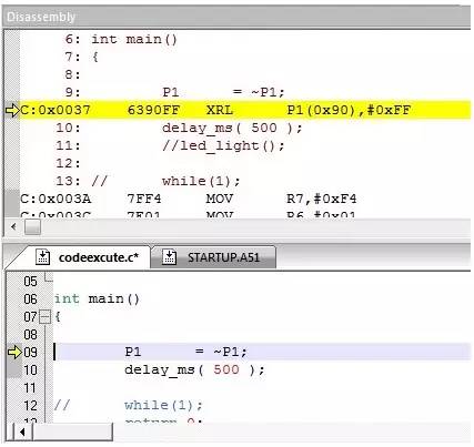 程序开始运行就在程序入口main函数的第一条语句之处,Disassembly窗口是c语言代码与汇编代码相对应的窗口,前面是地址,后面的是C语言对应的汇编语句。下面的窗口是相应文件的运行代码的位置,由黄色箭头指向当前正要执行的代码。然后点击单步运行工具条,指导跳出main函数为止,程序跳转到STARTUP.A51中的以下代码位置:
