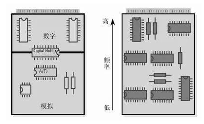 图4 (左)将数字开关动作和模拟电路隔离,将电路的数字和模拟部分分开。 (右) 要尽可能将高频和低频分开,高频元件要靠近电路板的接插件