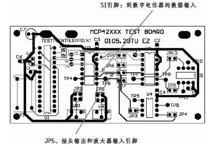 图3 这是对图2所示电路的第一次布线尝试。此配置在模拟线路上产生不规律的噪声,这是因为在特定数字走线上的数据输入码随着数字电位器的编程需求而改变。