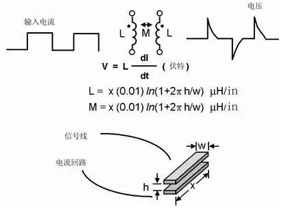在这两种走线配置中,一条走线上电流随时间的变化(dI/dt),由于这条走线的感抗,会在同一条走线上产生电压;并由于互感的存在,会在另一条走线上产生成比例的电流。如果在第一条走线上的电压变化足够大,干扰可能会降低数字电路的电压容限而产生误差。