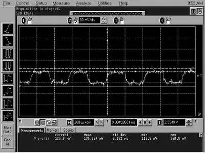 图 4 在此示波器照片中,最上面的波形取自JP1(到数字电位器的数字码),第二个波形取自JP5(相邻模拟走线上的噪声),最下面的波形取自TP10(16位D/A转换器输出端的噪声)。