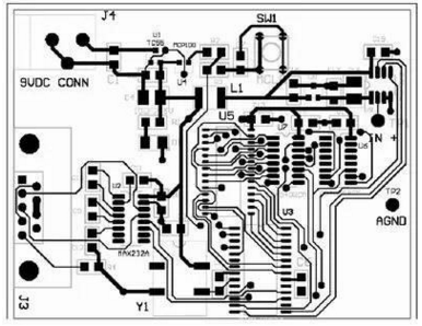 、图2 在此电路板上,使用不同的路线来布电源线和地线,由于这种不恰当的配合,电路板的电子元器件和线路受电磁干扰的可能性比较大
