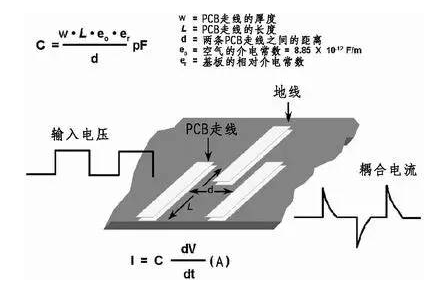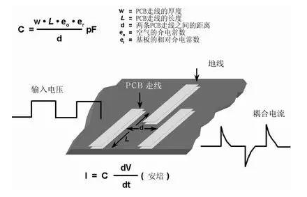 图1 在PCB上布两条靠近的走线,很容易产生寄生电容。由于这种寄生电容的存在,在一条走线上的快速电压变化会在另一条走线上产生电流信号。