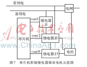 单片机通过cont0、cont1、cont2三个端口控制继电器J3、J1、J2,实现电机供电选择、电机旋转方向选择的功能[6],最终控制电机进行常用、备用电源切换,如图7。cont2驱动J2在常用电与备用电之间选择一路电为电机供电;cont0驱动J3控制电机的正转与反转。若J2直接同时接入常用电与备用电,则切换时电流较大,容易产生火花,比较危险,故设计cont1驱动J1控制备用电的接入,在J2接入备用电之前对备用电进行断开处理,仅当常用电不正常需要备用电时再去接通。