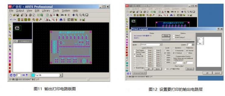 在设置对话框中,单击选择Printer,可以选择打印机和设置打印纸张以及版图放置方向。在下面的Layers/Artworks栏中选择要打印的层。因为布线是在底层进行的,所以在打印布线层时,在BottomCopper和Board Edge选项前打勾,表示选中要打印输出;而在打印元件的布局层(丝印层)时,在Top Silk 和Board Edge选项前打勾(这一层在打印时注意需要选择镜象打印);Scale选项是打印输出的图纸比例,选100%;Rotation 和Reflection选项分别是横向/纵向输出和是否要镜象的设置。设置好以后就可以打印了。