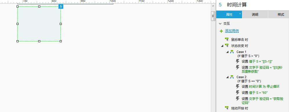 最后当“时间面板”循环时,选择时间面板元件,状态改变时,设置全局变量值为S=[S-1],设置文本于按钮文字 还剩[s]秒重新发送,当S=0时,“时间面板停止循环”再次赋值S=60,按钮文字为获取验证码。