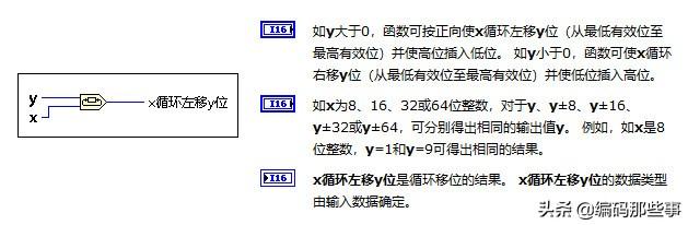 这是这个程序功能实现的主要代码,在超时事件中,通过移位寄存器中读取上次流水灯状态对应的数值,然后根据前面板上的控件设置决定流水灯是否移动、左移或右移及移动的位数,其关键函数是循环移位函数,该函数参数接口意义如下,通过给定y值的正负号控件其左移或右移: