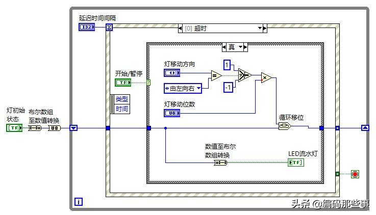 可能大家会想,如果一开始让你在LabVIEW中实现一个这么花哨的多种控制功能的流水灯小程序,你可能会觉得这太难了,甚至无从下手,实际上,通过上面的实现代码可看出程序也并不是太难,关键是要熟悉如事件结构、移位寄存器、循环移位及布尔数组与数值之间的转换等几个小知识点,把任务分解清楚,花不了几分钟也就可以做出来了。