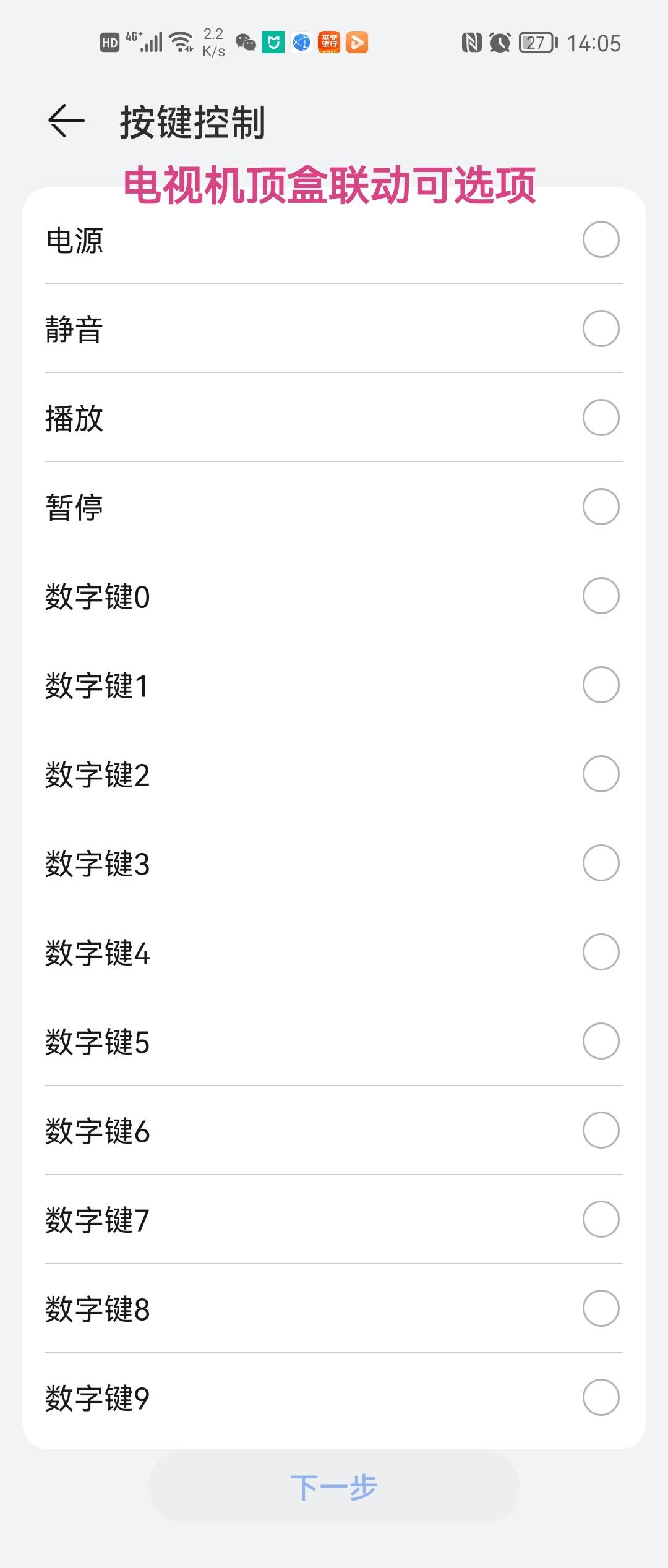 首先是电视机顶盒可以联动被控制的选项,主要有电源、静音、播放、暂停和数字按键0到9,