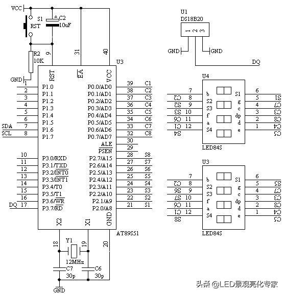 DS18B20典型应用电路见图9-8所示。DS18B20数据端接至单片机P3.7引脚,采用四位数码管显示温度值(3位整数,一位小数)。