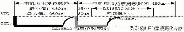 对DS18B20操作时首先要进行初始化:单片机发出复位脉冲,DS18B20以存在脉冲响应。当DS18B20发出存在脉冲对复位脉冲响应时,表明该器件已在总线上并作好操作准备。