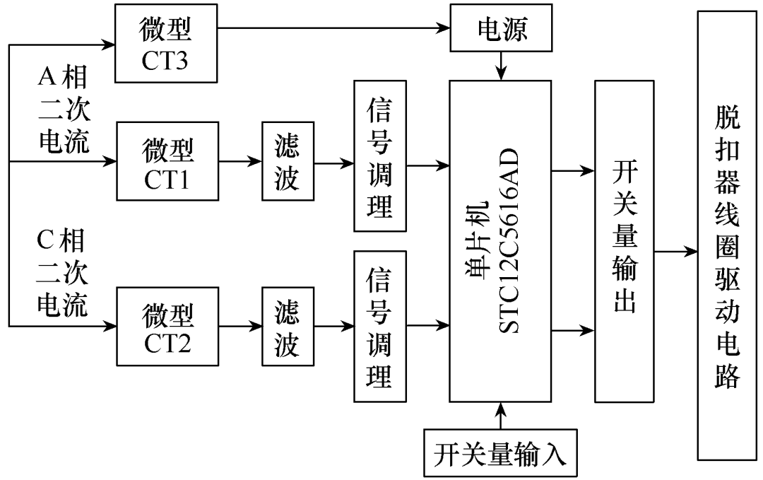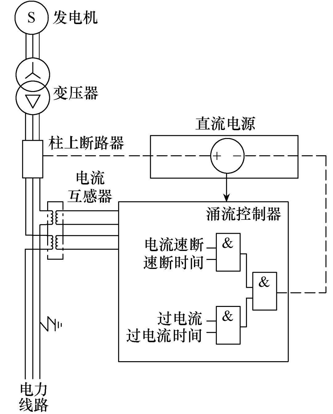 当电力线路短路时,产生短路电流。电流互感器将大电流变为小电流并输入涌流控制器。涌流控制器判断电流是否达到保护定值,满足条件闭合跳闸节点。直流电源给跳闸线圈供电,驱动开关跳闸。线路故障跳闸原理如图3所示。
