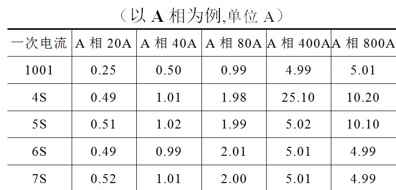 用大电流发生器分别给进线1001断路器CT和4条线路保护CT一次侧加电流,校验保护CT的精度10P20,即在20倍额定电流下误差不超过10%。结合线路最大短路电流和电流速断保护定值,受大电流发生器的量程限制,最大电流试验值为2倍额定电流。