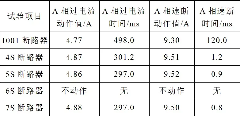 试验方法:在断路器A、B、C三相一次侧加用三相大电流发生器模拟产生的三相短路电流,记录动作电流,同时记录动作时间,记录见表5。