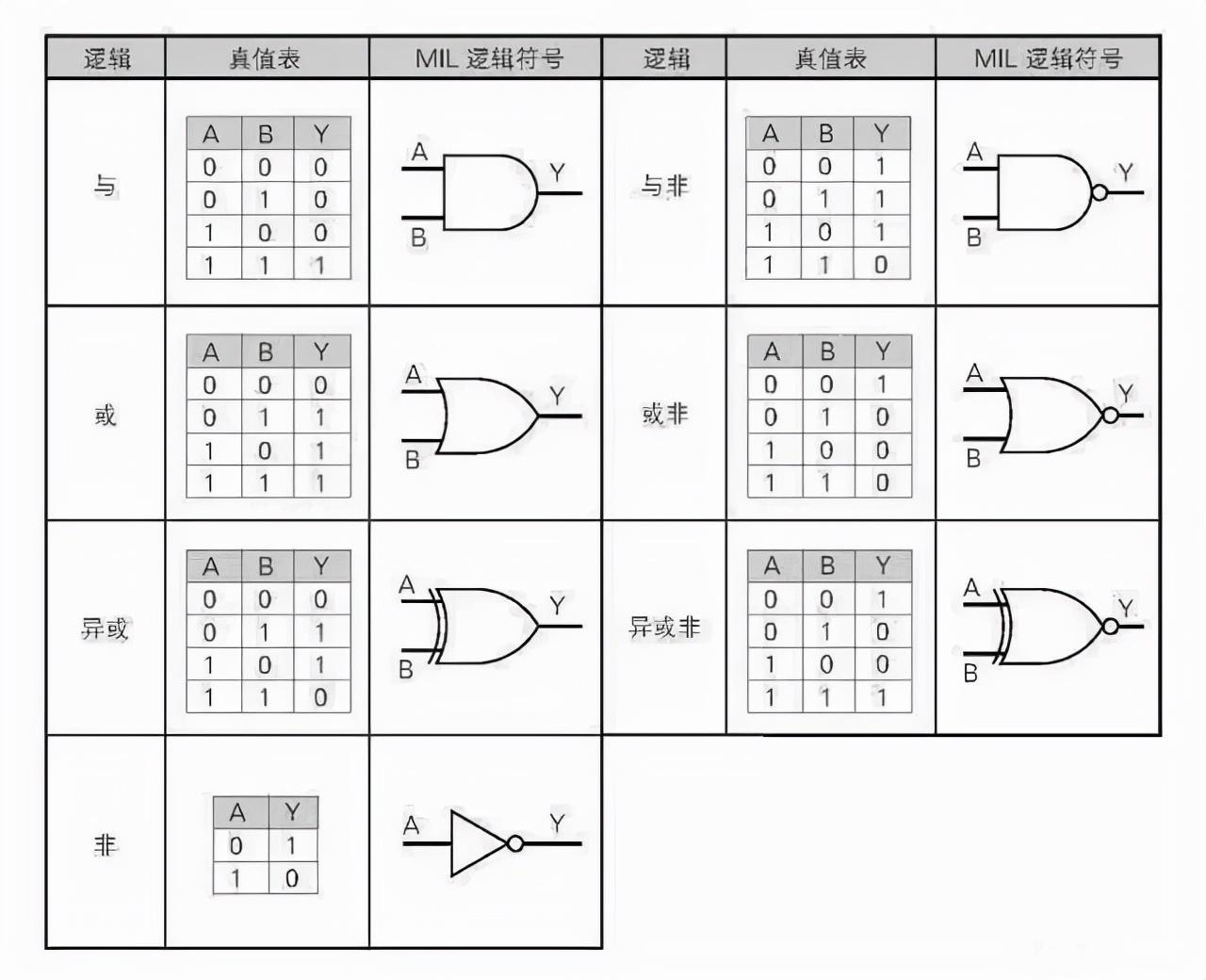 晶体管通过各种组合方式构成门电路:与门,或门,非门,异或门等。门电路又称为逻辑门,是数字电路的基础,常见门电路,及其真值表: