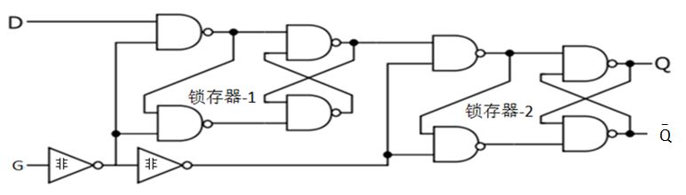 当锁存器-1控制G为有效信号时,D的输入传到到锁存器-2的输入,但是此时锁存器-2的控制信号不是有效的,所以锁存器-2的输出Q没有改变;当锁存器-1的控制G变为无效,锁存器-2的控制信号变为有效,锁存器-2的输出Q就改变了,也就是触发器的D输入传到了Q,并且D没有输入就一直不变。