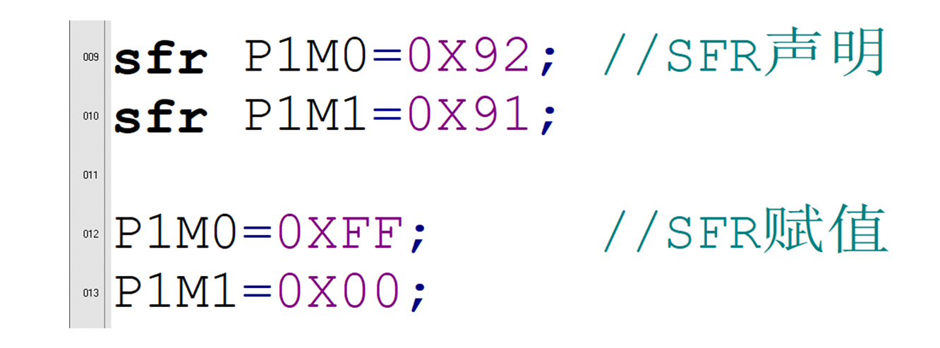 在使用相应的寄存器时,先声明寄存器地址,再对寄存器赋值即可。比如我们要将P1端口的输出模式配置为推挽输出,这样操作即可。如图4.