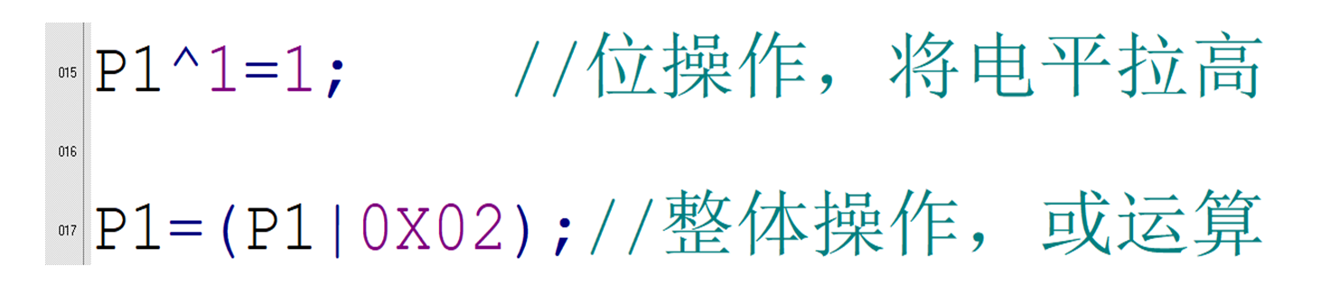 例如我们将P1端口的第二位电平拉高,可以直接对该位进行赋值,而不不必对整个P1端口进行或运算。