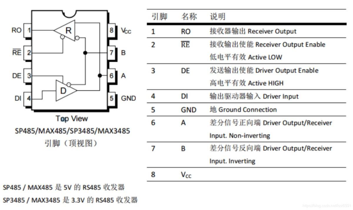485芯片既有全双⼯通信(如SN75179、SN75180、MAX488~MAX491、MAX1482)也有半双工通信(如SN75176、SN75276、SN75LBC184、MAX485、MAX 1487、MAX3082、MAX1483),如果485为半双工通信模式,其在发送信息时便无法读取信息,因此当DE被拉高时完全处于发送信息的状态,此时DI接受单片机写入的数字信号,当输⼊信号DI为1时输出正的差分信号,即A-B>0.2V。当输⼊信号DI为0时输出负差分信号,即B-A>-0.2V(有些芯片是0.3V,⽐如SP3485)