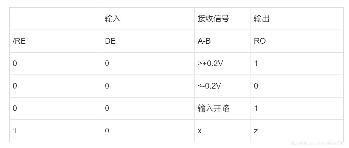 当DE被拉低时,依据/RE(低电平有效)的电平判断⼯作状态,当/RE为高时,整个器件不⼯作,输出高阻态,当其在低电平下使能时,则由输⼊的AB差分信号向RO输出0或1,其真值表如下。