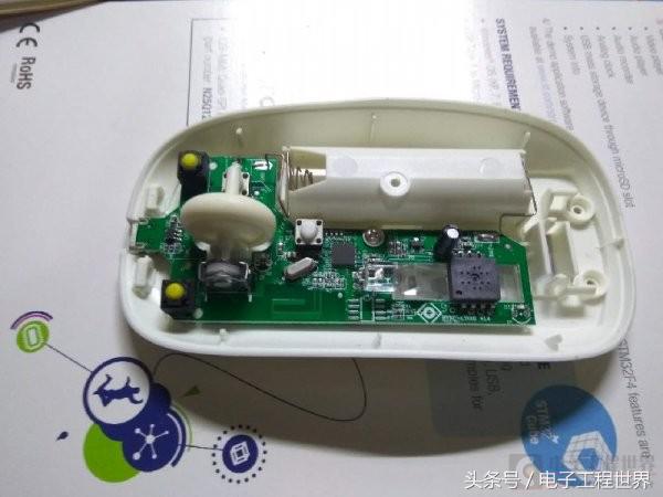 鼠标很容易拆,将电池取下后,就可以看到固定螺丝。这个鼠标只用1个螺丝固定,在鼠标脚垫下没有螺丝(有些鼠标可能有,后面两个鼠标脚垫处有螺丝柱)。取下螺丝后,就很容易将鼠标上盖和底部分离,看到里面的主板了。