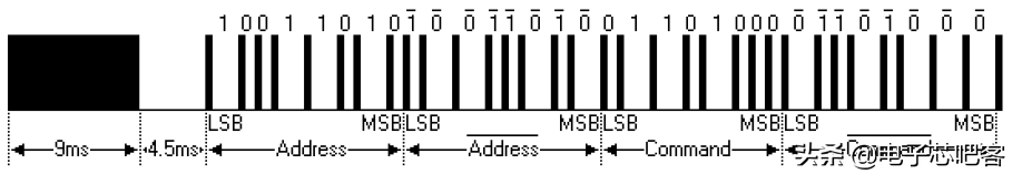 开始时发射一个特定的同步码头,对于接收端而言就是一个9ms的低电平,和一个4.5ms的高电平,这个同步码头可以使程序知道从这个同步码头以后可以开始接收数据。