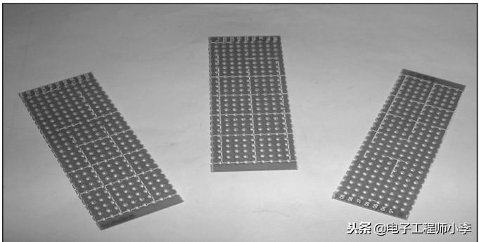 02 然后在其中的一块洞洞板背面分别焊接上贴片LED和470Ω的贴片电阻,此作品要求越小越好,因此元器件都选用了贴片封装以减小体积,LED从左往右的排列为红、绿、蓝、红、绿、蓝(对应单片机的P3.0~P3.5引脚)。为了显示出七彩的效果,一定要按照红、绿、蓝的排列顺序,这三原色能组合出多种不同的颜色。注意要在中间间隔两个焊盘的位置,因为这块板子是放在左边的位置,也就是单片机P3组引脚的一边,为了更好地方便后面的对应焊接,中间跳过晶体振荡器引脚部分而焊接,焊接完成后如图所示。