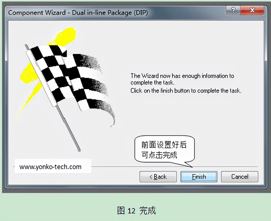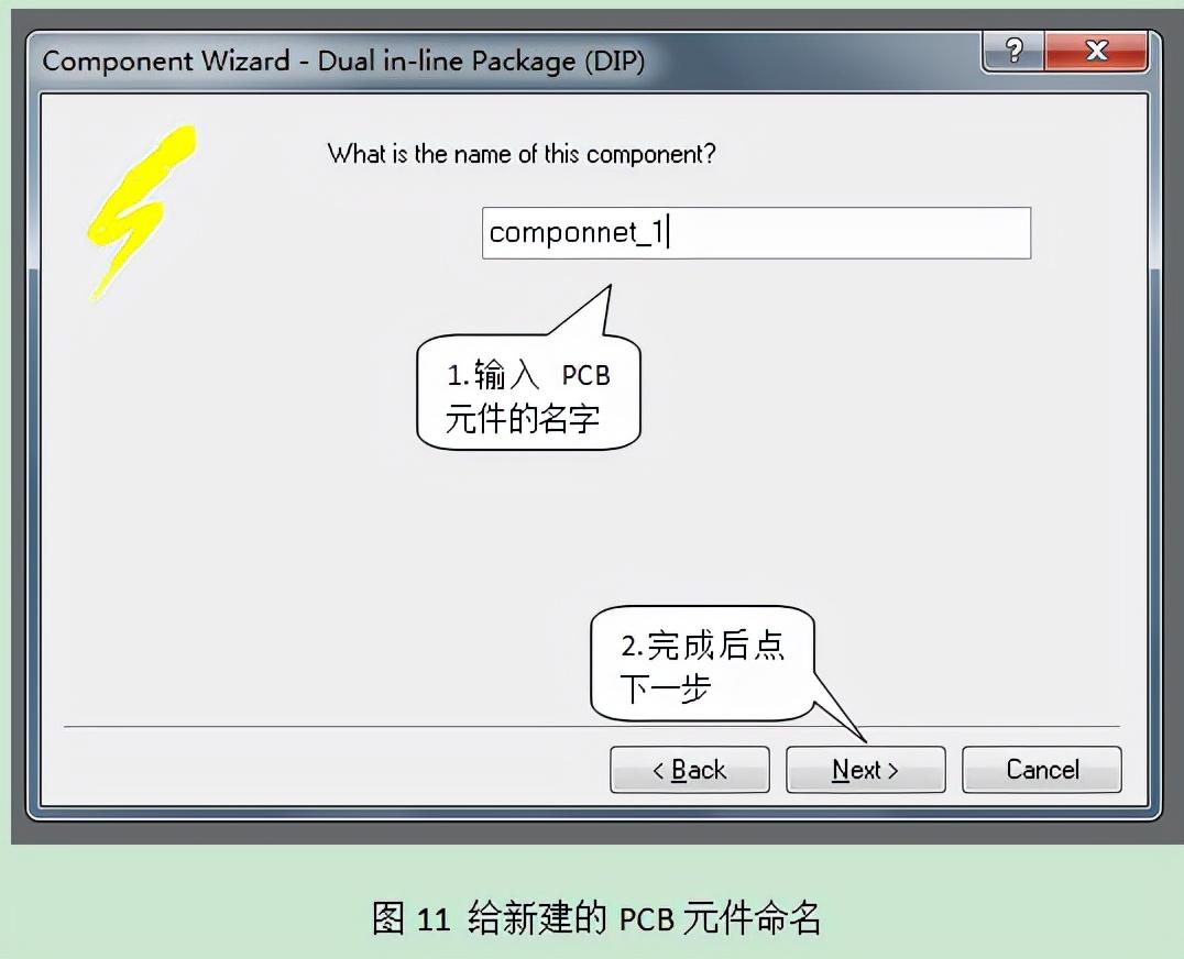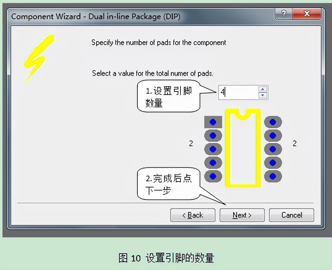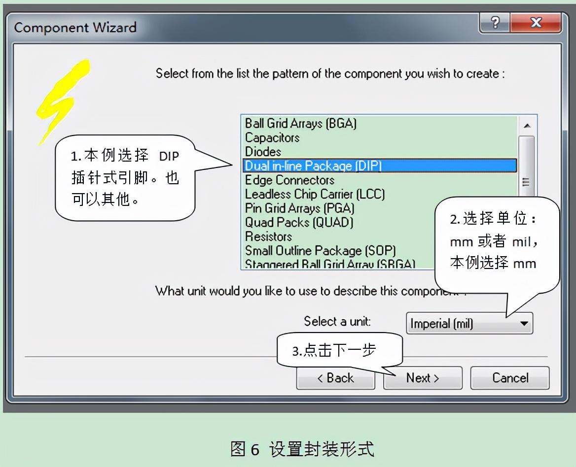 设置封装形式:本步骤选择元件是哪一种封装,本例选择DIP,就是插针式引脚,当然也有其他形式,根据需要选择。完成后点next。