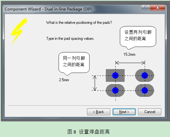 设置焊盘距离:包括设置同一列焊盘之间的距离,两列焊盘之间的距离等参数。完成后点下一步next。