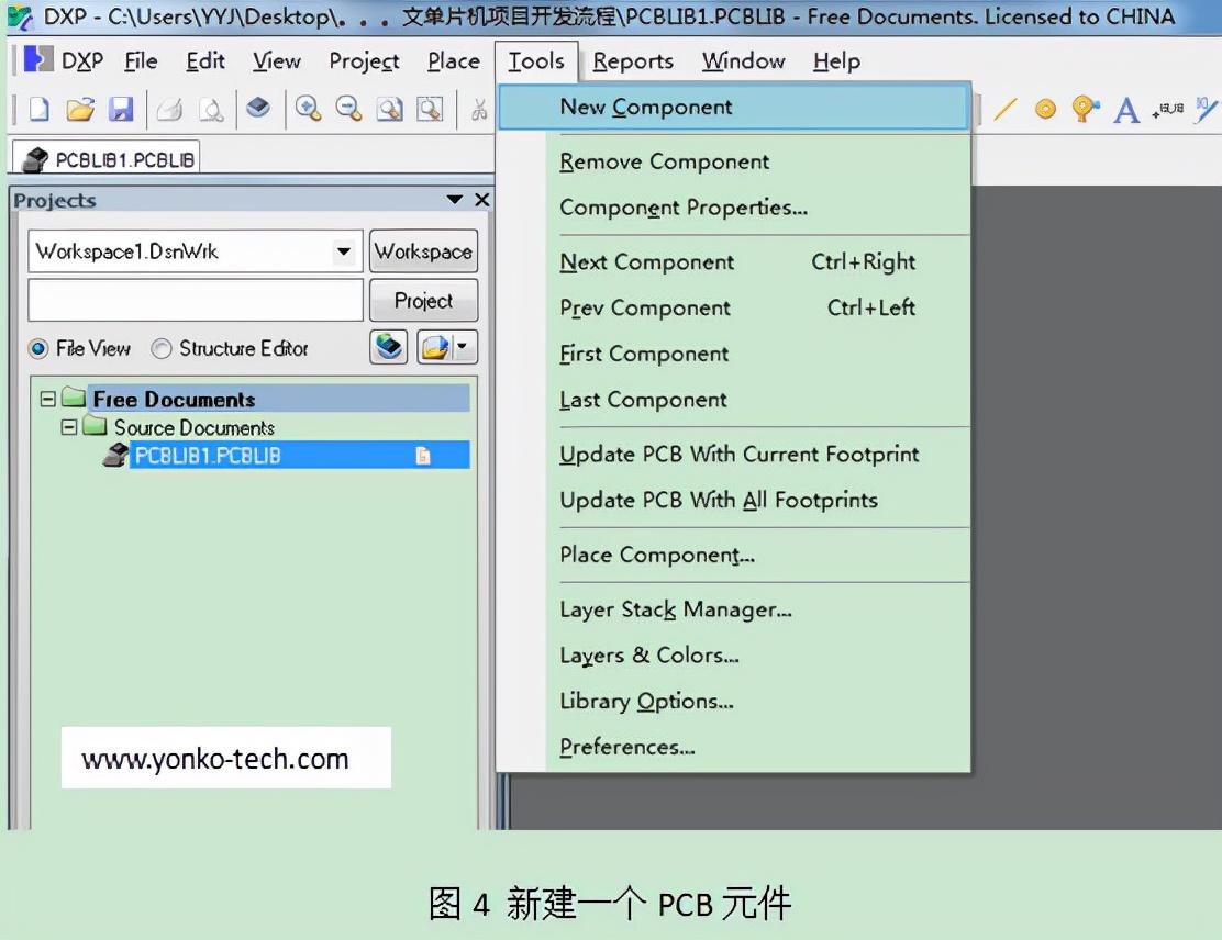 新建:在要操作的PCB库里,点击tools→new componnet,就能进入新建一个PCB元件的设置向导