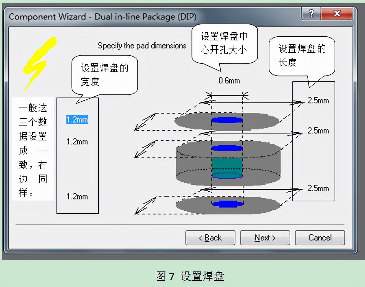 设置焊盘信息:包括开孔(DIP有开孔,SOP等表面贴是没有开孔的。开孔一般比DIP元件的引脚要大点点才好安装)、焊盘尺寸等。完成后点next。