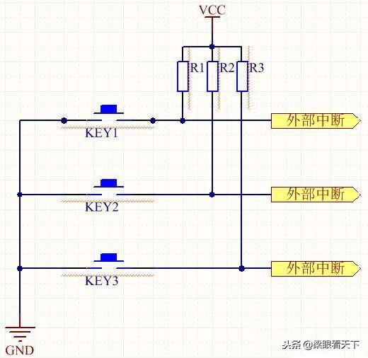 三是将按键接到外部中断引脚上,利用按键按下产生的边沿信号进行按键检测,如图1.3所示;