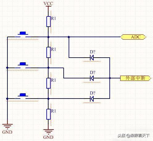改进二:在原有的ADC按键的基础上,也可用增加二极管的方式,实现按键中断,并在中断服务程序里进行AD转换,从而识别按键。电路如图1.6所示。