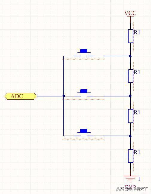 四是利用单片机的ADC,在不同的按键按下后,能够使得ADC接口上的电压不同,根据电压的不同,则可以识别按键,如图1.4所示。